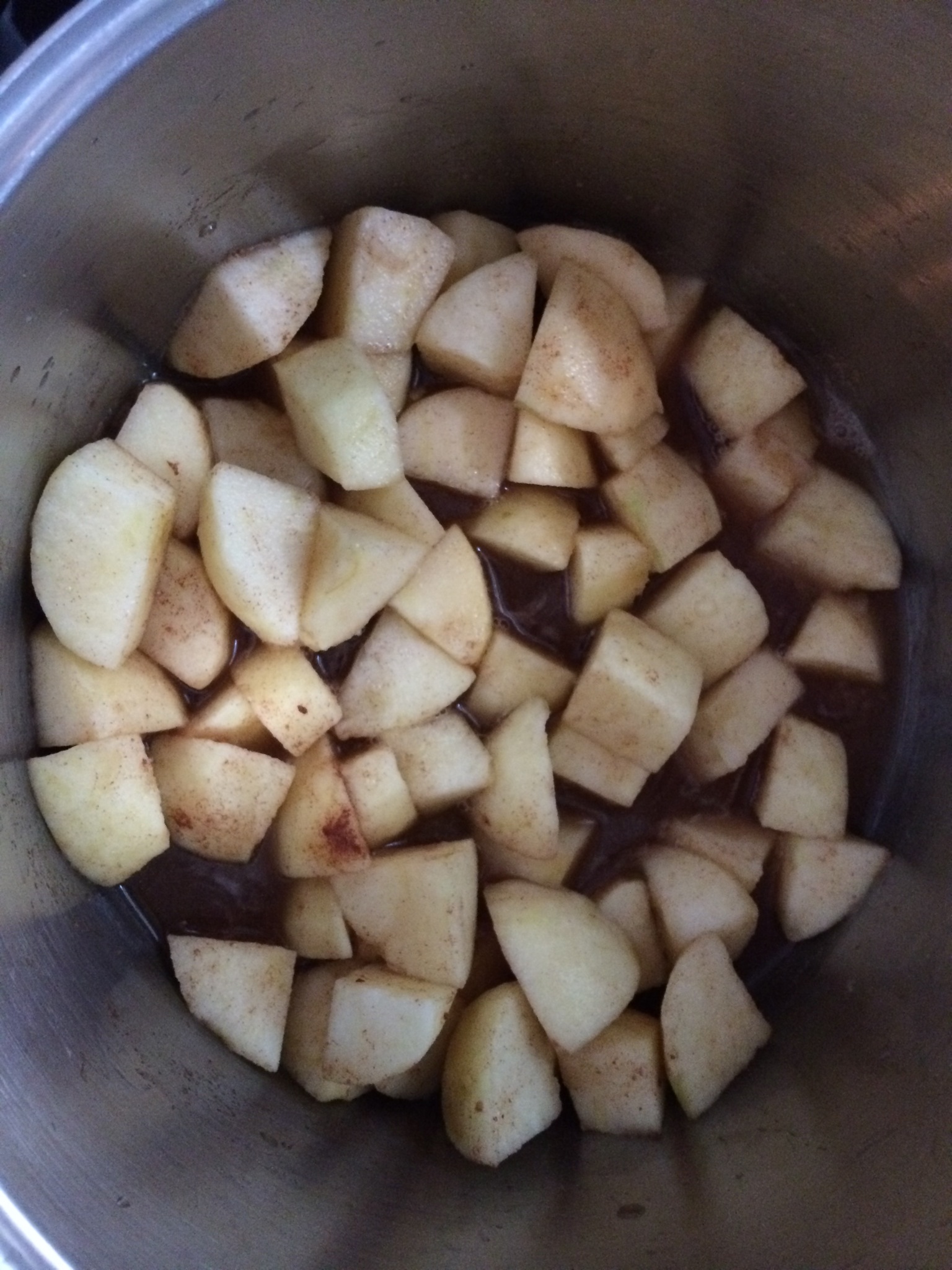 Start with 4 medium apples. Peel them and cut them each into 8 sections, or use an apple corer and it does this for you automatically. After I cut them into 8 sections, I actually cut them once further, so they were smaller chunks. But this is optional and totally up to you.
